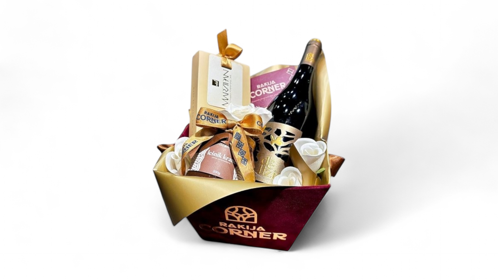 Poklon pakovanje sadrži: Vino crveno La Delizia Merlot, Reel Marcipan i tamna čokolada 100g i Slatka Domaćica lešnik kranč krem 200g.
