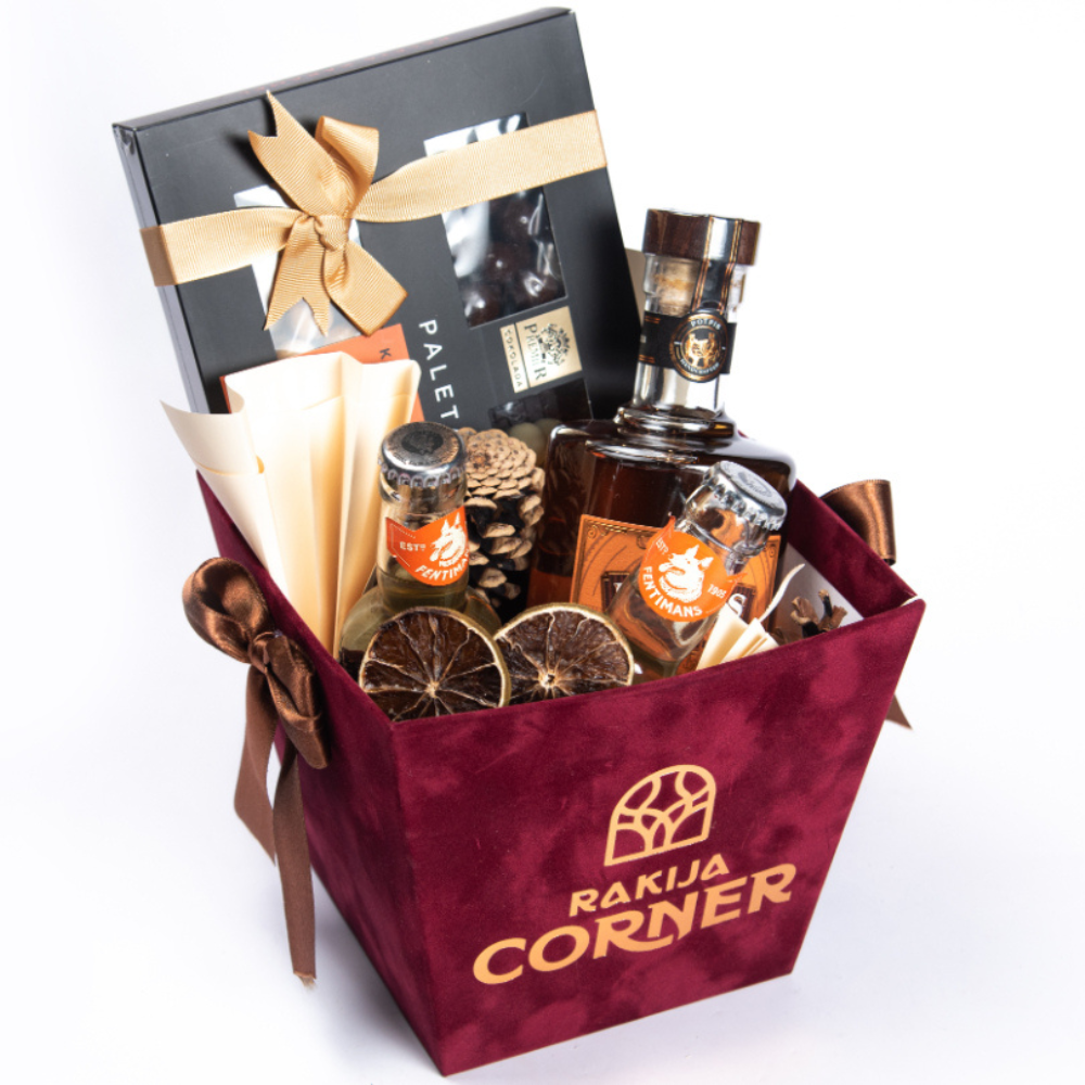 Poklon pakovanje sadrži: Potpis Barrel Aged Orange gin 700ml, Premier draže bombonjera karamel 180g i Fentimans Valensian orange 200ml.