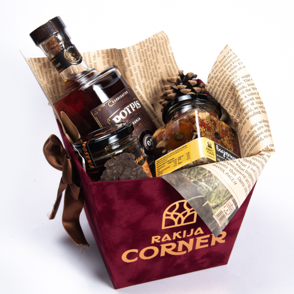 Poklon pakovanje sadrži: Potpis Dunja 05 barik 700ml, Nectar suvo jezgrasto voće u bagremovom medu 390g i Spajsoje slatko ljuti namaz od paprike žuti 220g.