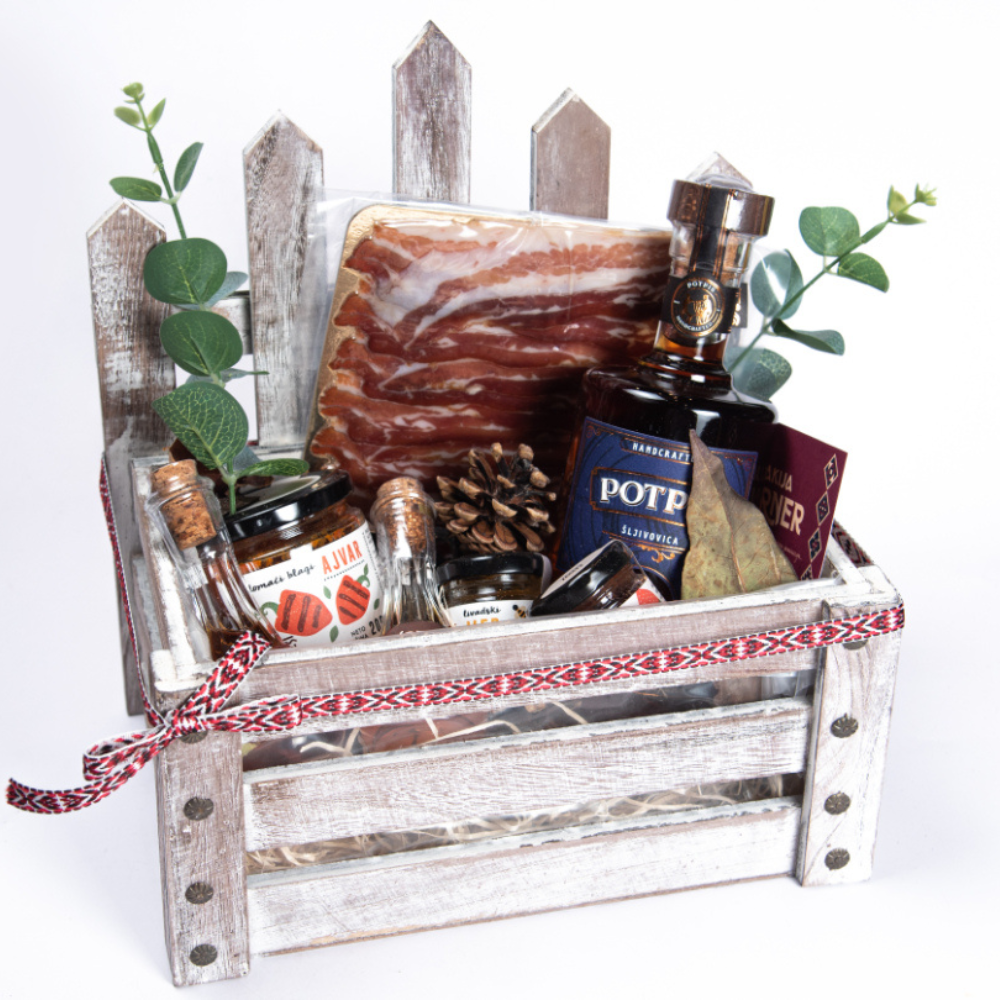 Poklon pakovanje sadrži: Potpis Šljiva 05 barik 500ml, Meze pančeta slajs 100g, Dunst ajvar blagi 200g, Potpis dunja 05 barik čokanj, Potpis kajsija 05 barik čokanj, Dunst livadski med 40g i Dunst extra džem jagoda 35g.