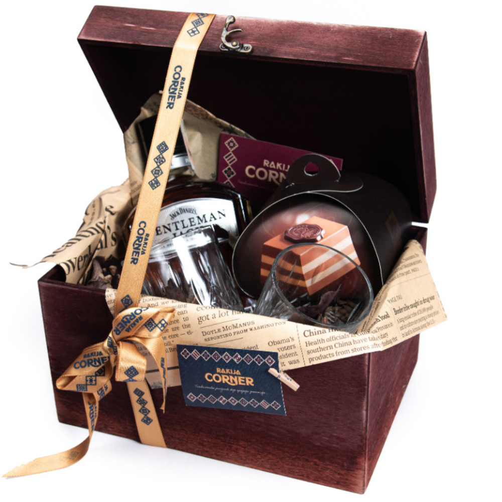 Poklon pakovanje sadrži: Jack Daniels Gentleman Jack Whiskey 700ml, Potpis čaša za viski x2 i Premier kraljevski desert.