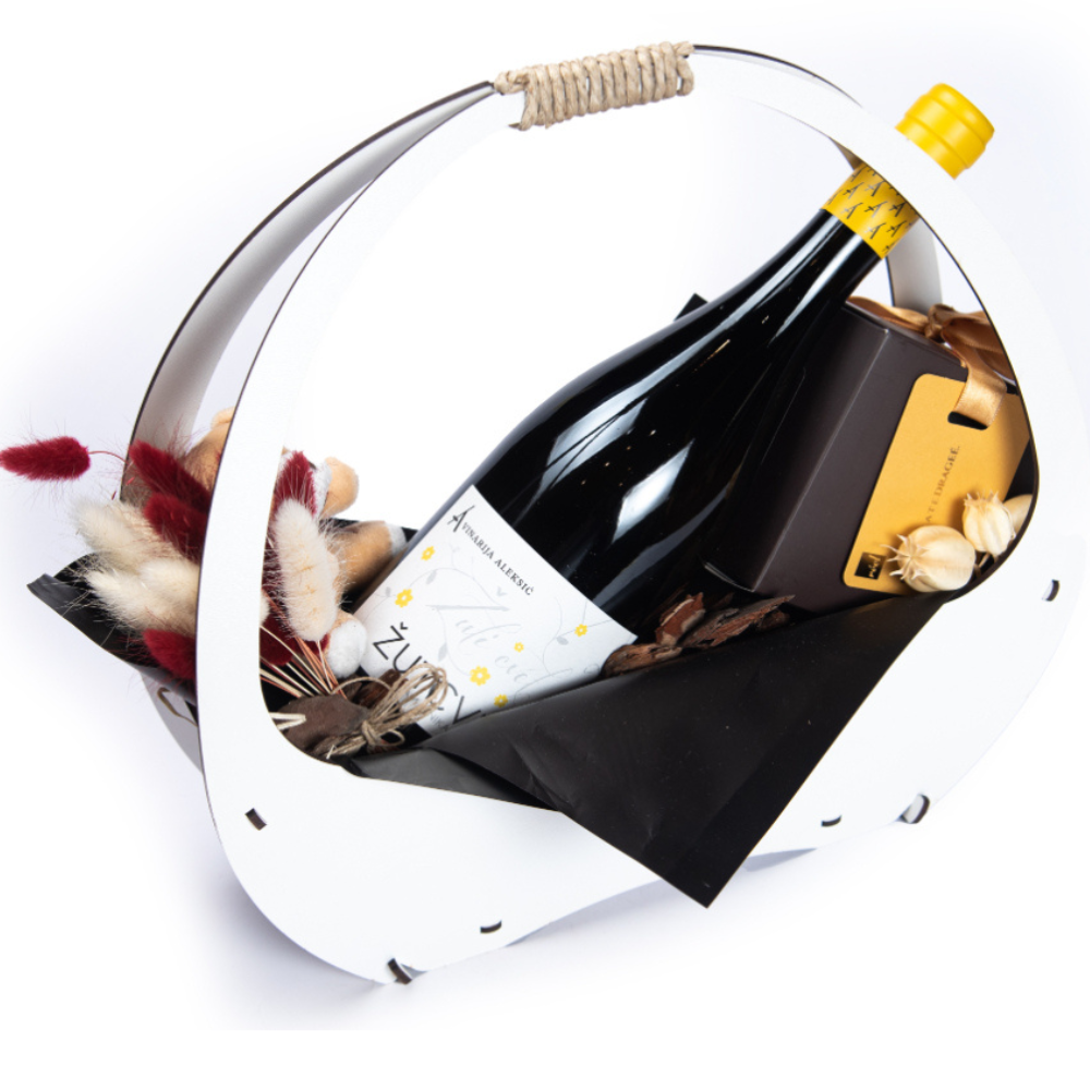 Poklon pakovanje sadrži: Vino belo Aleksić Žuti Cvet 0,75L i Reel mix dražeja lešnik, kokos, badem 120g.