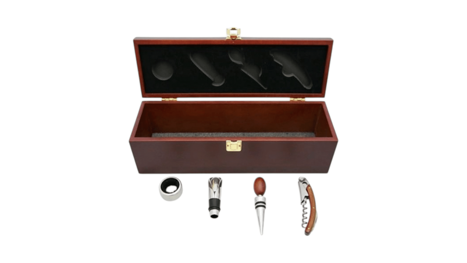 Elegantni četvorodelni set za vino u kvalitetnoj drvenoj kutiji tamno-braon boje.