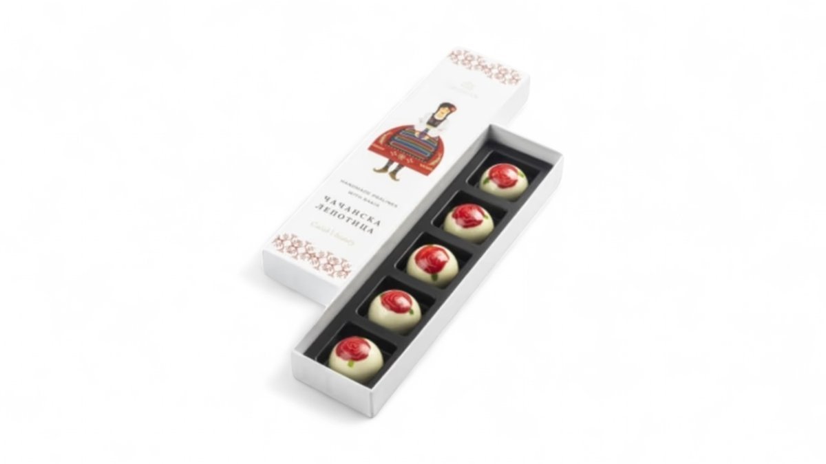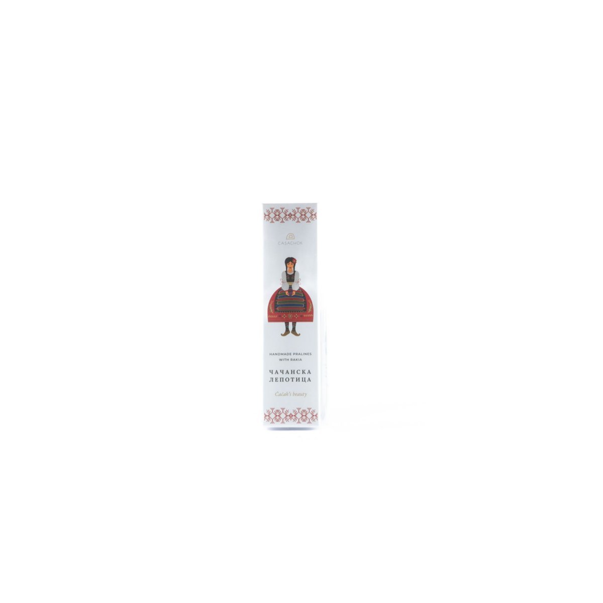 Radi se o elegantnoj bombonjeri – setu od 5 ručno pravljenih pralina koji kombinuju kremu od mlečne čokolade i rakije od šljive, ponekad s dodatkom karamel kreme