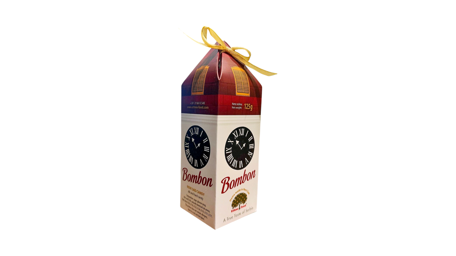 Ethno Food Bombone Novi Sad 125g su klasične voćno‑slatke bombone upakovane u ambalažu sa motivima Novog Sada, idealne za poklon ili suvenir.
