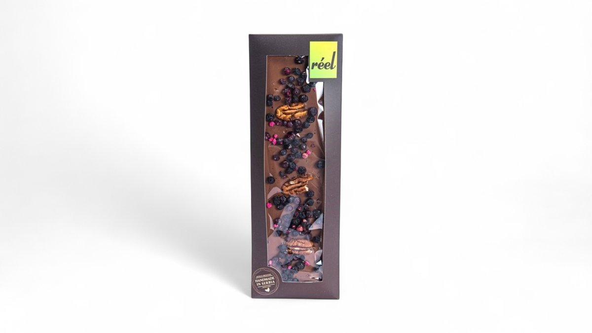 Reel Mlečna čokolada borovnica, kandirana ruža, pekan orah 115g