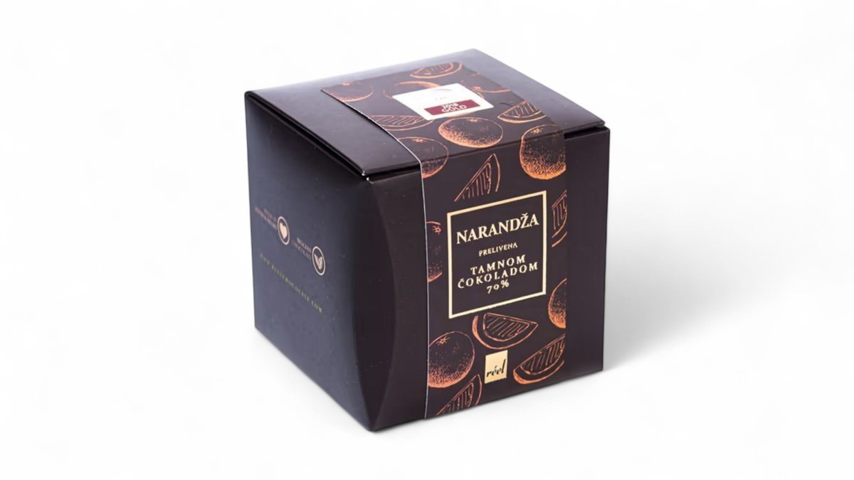 Kandirana narandža posuta cimetom i karanfilićem, prelivena tamnom čokoladom 70%.