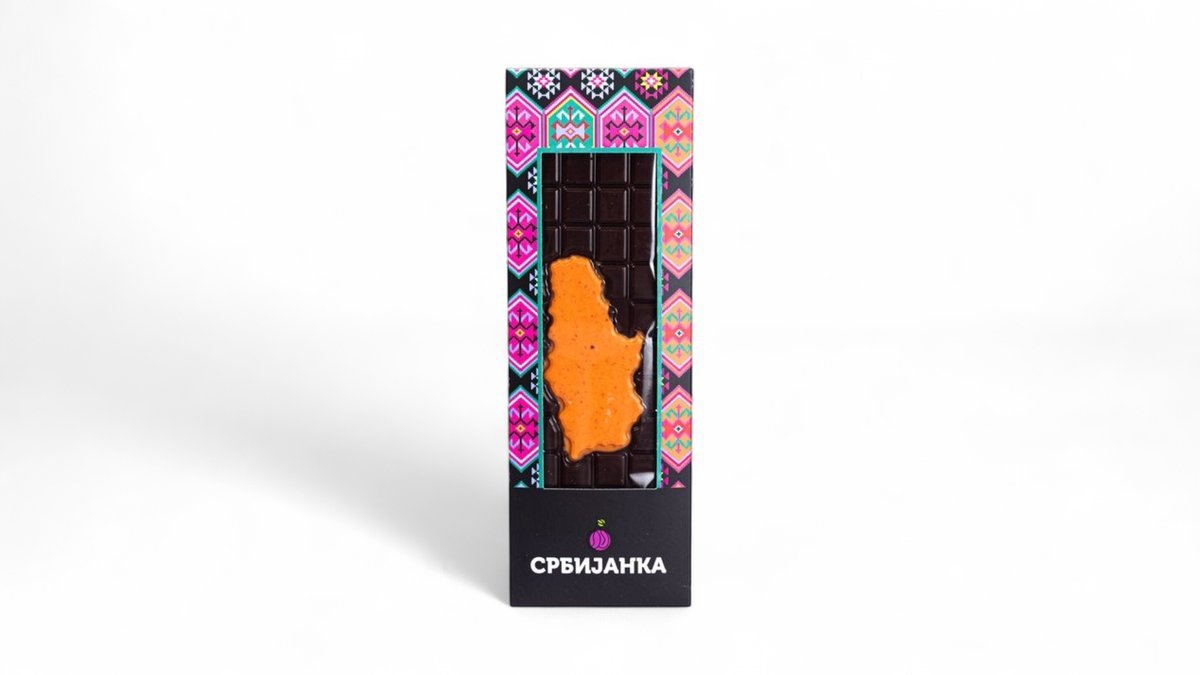Predstavljamo vam ekskluzivnu poslasticu – “Srbijanka tabla”, crna čokolada težine 110g, oblikovana prema konturama Srbije, obogaćena liofiliziranom narandžom.